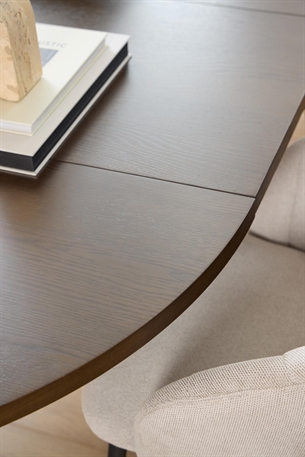 Med sin fleksible udtræksfunktion passer A-Line spisebord perfekt til hjem, hvor pladsen skal kunne tilpasses efter behov. Den runde form skaber et indbydende miljø, mens den røgfarvede træfinish tilfører varme og elegance.