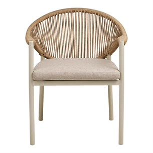 Farverne sand og natur giver Abela spisebordstol et lyst og tidløst look, som passer ind i mange typer uderum. Det gør stolen til et sikkert valg, hvis du ønsker havemøbler, der både er dekorative og funktionelle i hverdagen. Den flettede struktur skaber dybde i designet, mens aluminiumrammen tilfører et moderne præg.