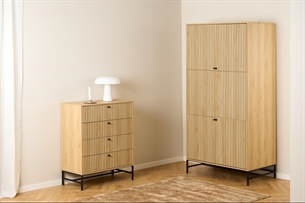 Få et klædeskab, der både er rummeligt og stilfuldt, med Albany i eg melamin og sort stål. Bestil i dag hos Møbellageret og få hurtig levering!