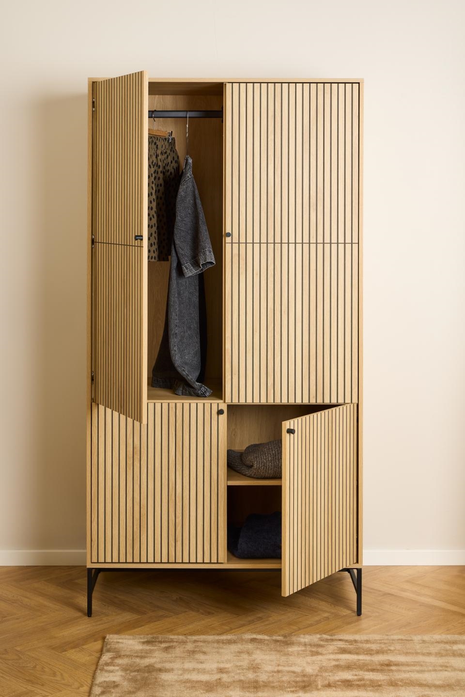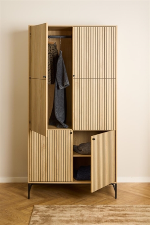 Opgrader din garderobe med Albany klædeskab – en perfekt kombination af funktionalitet og moderne design. Skabet er fremstillet i eg ru melamin, der giver en autentisk træstruktur og en slidstærk overflade. Det industrielle stel i mat sort ru pulverlakeret stål skaber en flot kontrast og sikrer en robust konstruktion. De fire døre med dekorativ lamelfront tilfører et eksklusivt præg, mens de seks rummelige hylder og en integreret bøjlestang gør det nemt at holde orden i din garderobe.