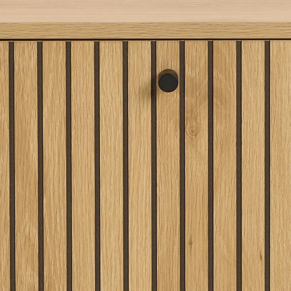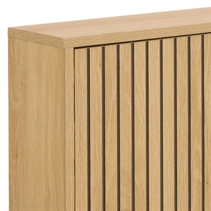 Det pladsbesparende design gør Albany skoskab til en praktisk løsning for mindre entréer og smalle gange. Den naturlige træfinish i eg melamin tilfører varme til rummet og gør det nemt at kombinere skabet med andre møbler i hjemmet.