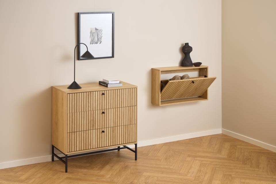Albany skoskab er designet til at skabe orden og overblik i din entré. Den rummelige skuffe giver plads til flere par sko og holder dem diskret gemt væk, samtidig med at de stadig er let tilgængelige. Det væghængte design skaber en svævende effekt, som giver rummet et luftigt og moderne udtryk.