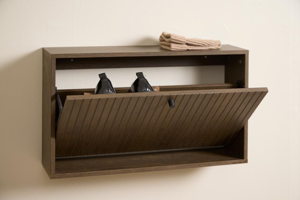 Albany skoskab er en stilfuld og funktionel løsning til opbevaring af fodtøj i entréen eller garderoben. Det er fremstillet i røgefarvet eg ru melamin, som giver en smuk og naturlig træstruktur, der tilfører varme til rummet. Med sit slanke design og vægmontering er skabet perfekt til mindre rum, hvor gulvpladsen skal udnyttes optimalt.