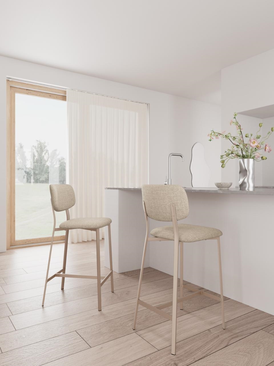 Alison barstol i beige stof er en elegant og funktionel løsning til dig, der ønsker en stilren siddeplads ved køkkenøen eller barbordet. Med sin lyse farve og enkle design tilfører denne barstol varme og lethed til indretningen, samtidig med at den leverer høj komfort i hverdagen.