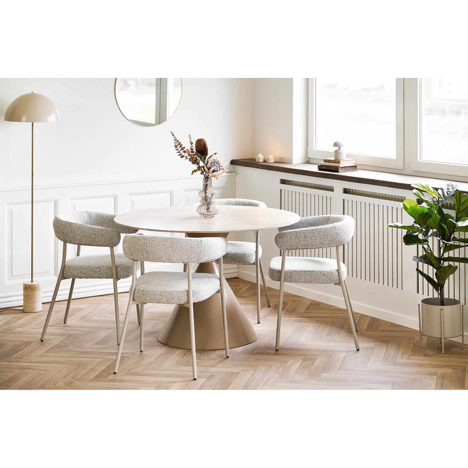 Annecy spisebord passer perfekt ind i hjem, hvor rolige farver og naturlige materialer er i fokus. Den sandfarvede keramiske bordplade fungerer flot sammen med træ, tekstiler og andre naturmaterialer og bidrager til et harmonisk og stilrent udtryk i spisestuen.