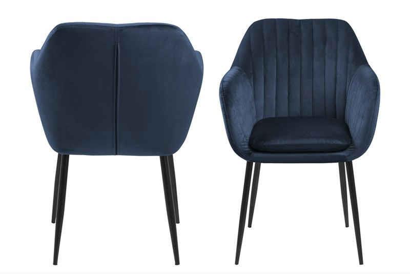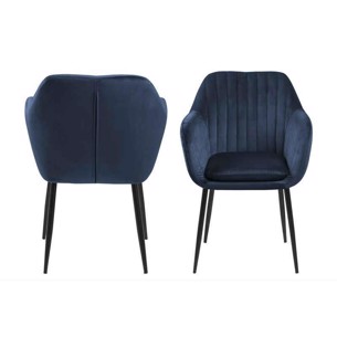 Emilia spisebordsstolen med armlæn kombinerer moderne elegance og funktionel komfort. Med sit bløde Vic-stof i mørkeblå og sorte metalstel tilbyder den et luksuriøst, men robust møbel, perfekt til både spiseplads og opholdsrum.