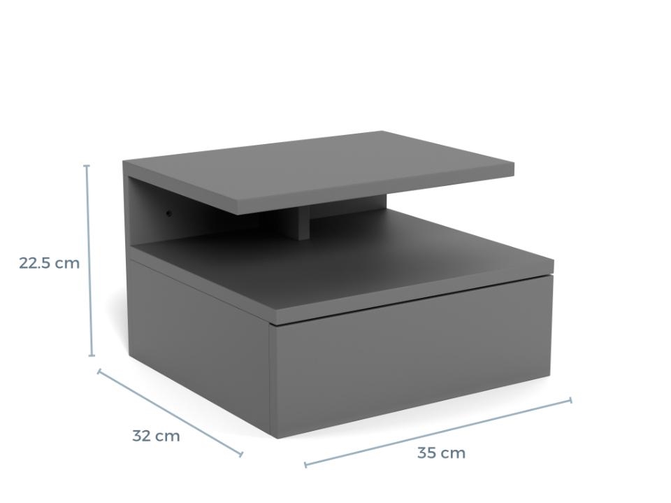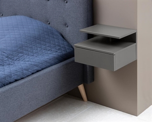 Den grå farve giver sengebordet et moderne og alsidigt udtryk, som passer ind i både skandinaviske og mere industrielle indretninger. Det væghængte design skaber en let og svævende effekt, som gør rummet mere åbent og luftigt.