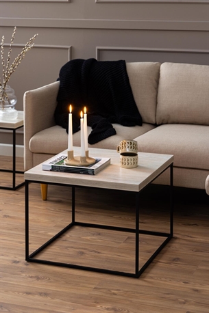 Barossa sofabord kombinerer tidløst design med funktionalitet. Bordpladen i travertin ru melamin giver et eksklusivt og naturligt udtryk, mens det mat sorte ru pulverlakerede stålstel tilfører en moderne kontrast. Med sin firkantede form og rummelige bordplade er dette bord både dekorativt og praktisk.