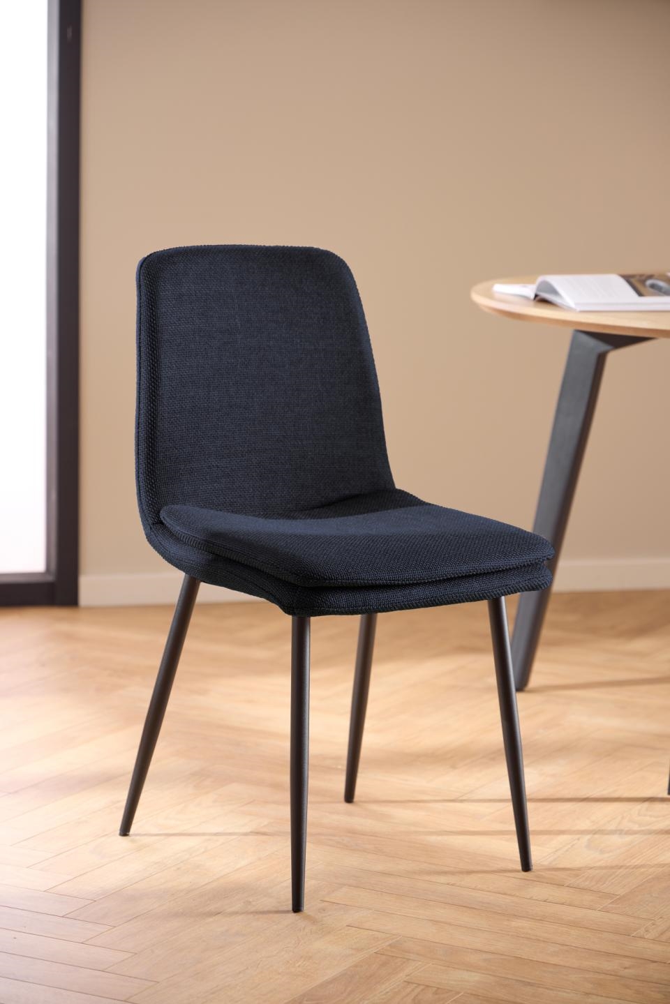 Tilføj et stilfuldt og sofistikeret udtryk til din spisestue med Becca spisebordsstol. Stolen er betrukket med Basel stof i mørkeblå, en dyb og elegant nuance, der tilfører ro og eksklusivitet til indretningen. Det mat sorte ru pulverlakerede stålstel giver en flot kontrast til det bløde stof og sikrer samtidig en solid og holdbar konstruktion.