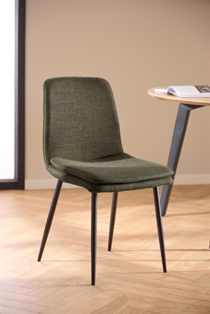 Giv din spisestue et stilfuldt og indbydende udtryk med Becca spisebordsstol. Stolen er betrukket med Basel stof i grøn, en dyb og naturlig nuance, der tilfører varme og elegance til rummet. Det mat sorte ru pulverlakerede stålstel skaber en flot kontrast og sikrer en robust og stabil konstruktion.