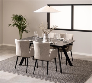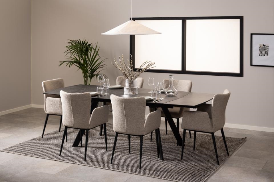 Blackburn spisebord er en moderne og funktionel løsning til spiseområdet. Bordpladen i sort Fairbanks ru keramik har en elegant, naturlig struktur og er både ridsefast og varmebestandig. Stellet i mat sort ru pulverlakeret stål giver et stilrent og industrielt udtryk, mens den smarte opbevaringsfunktion til tillægsplader sikrer fleksibilitet i hverdagen.