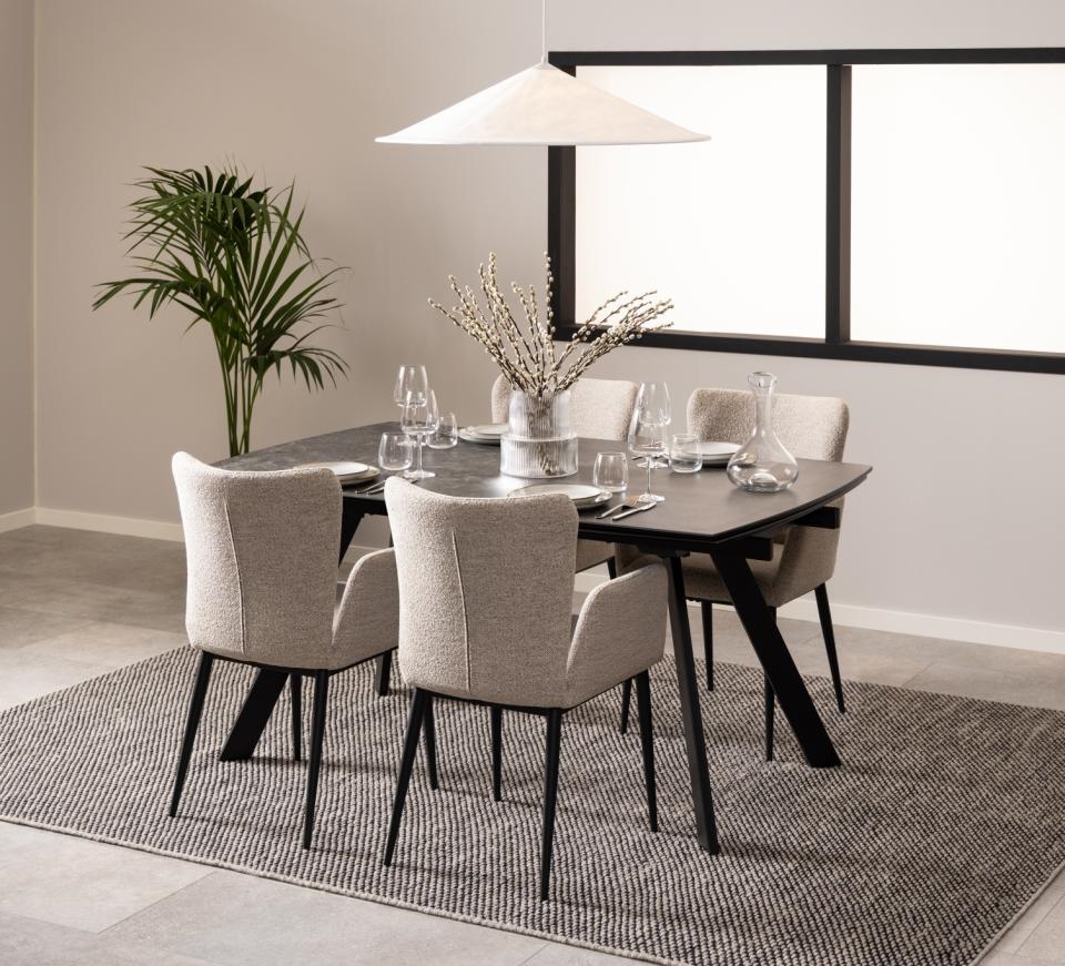 Den sorte keramikbordplade giver et sofistikeret og eksklusivt look, mens det sorte stålstel understreger bordets minimalistiske og industrielle design. Dette spisebord passer perfekt til moderne, skandinaviske og industrielle indretninger.