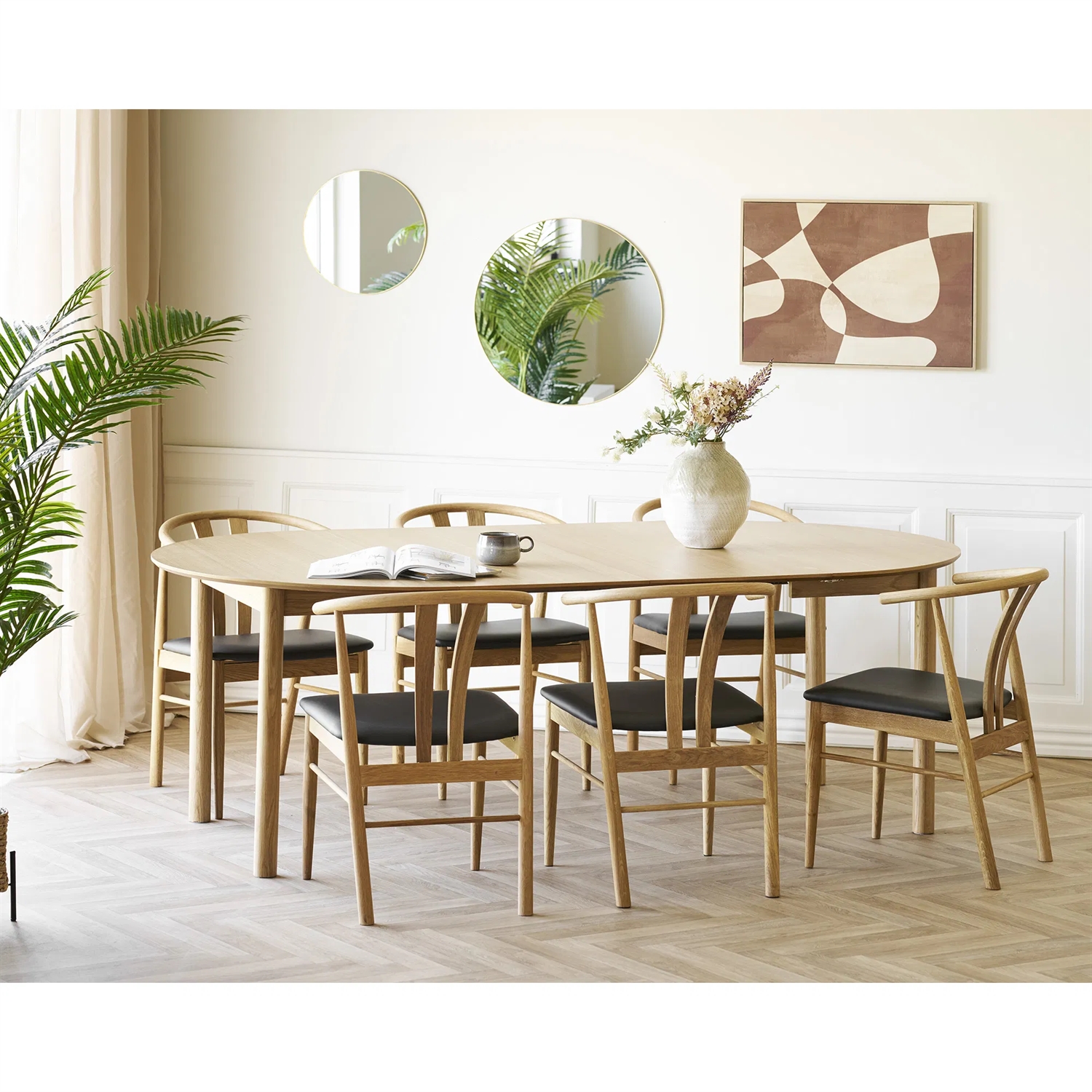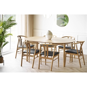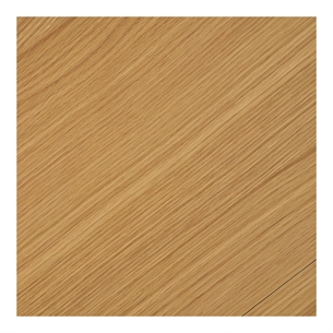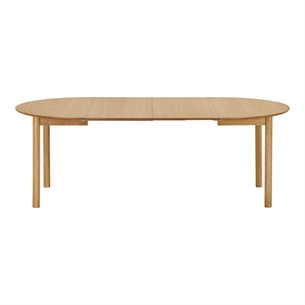 Bordpladen er fremstillet i MDF med egefiner, der kombinerer den naturlige skønhed fra eg med en stærk og praktisk kerne. Den naturlige farvetone fremhæver træets struktur og giver et tidløst udtryk. Tillægspladerne gør det nemt at justere størrelsen efter behov.