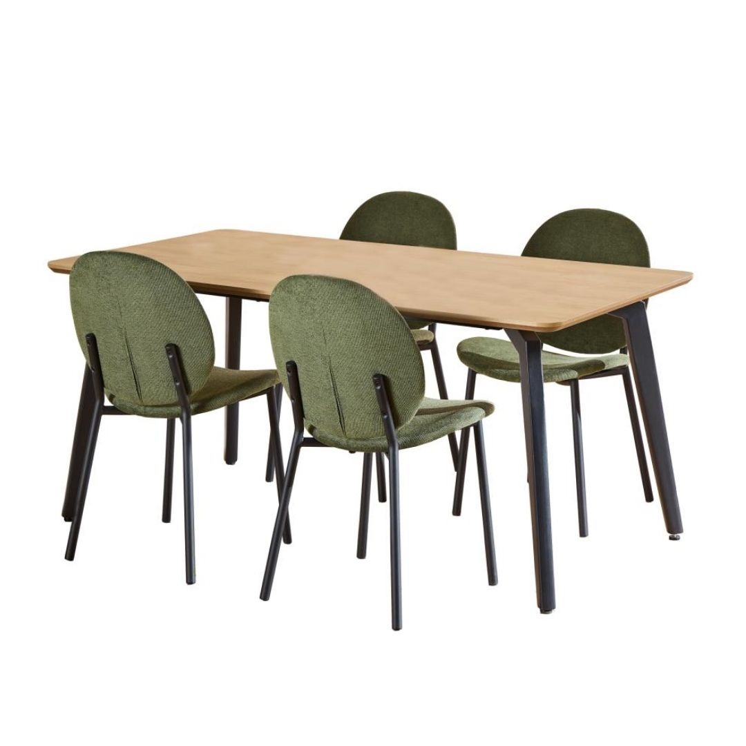 Cadiz rektangulært spisebordssæt 160x90 cm med 4 stole i skovgrønt stof er et moderne og karakterfuldt valg til dig, der ønsker en spiseplads med både funktion og personlighed. Kombinationen af det varme trælook og de dybe grønne nuancer skaber en indbydende og stilfuld atmosfære i hjemmet.