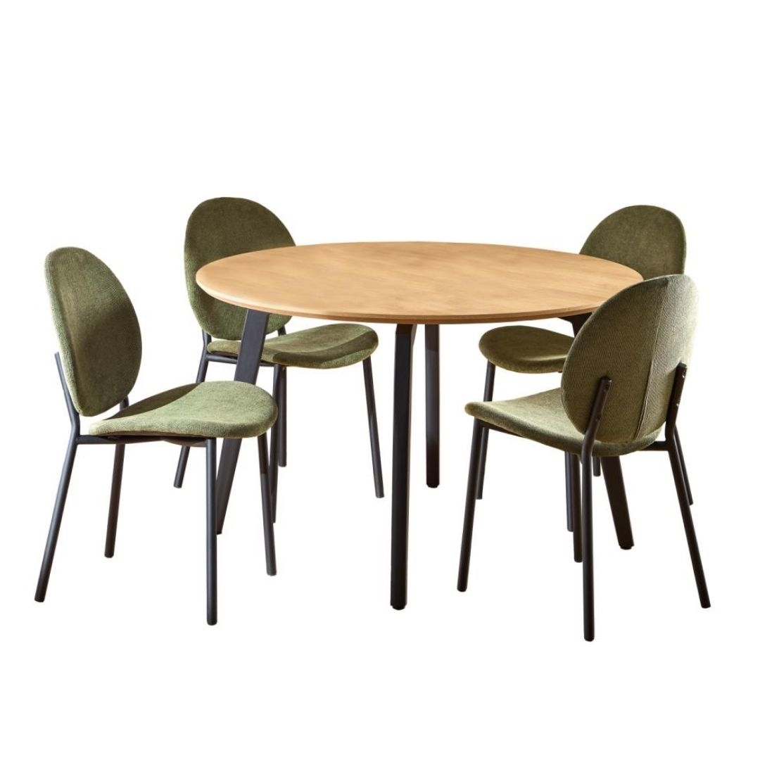 Cadiz rundt spisebordssæt Ø120 cm med 4 stole i skovgrønt stof er et moderne og karakterfuldt valg til dig, der ønsker en spiseplads med personlighed. Kombinationen af naturligt trælook, mørkt stel og den dybe grønne farve skaber en stilfuld og indbydende helhed i hjemmet.