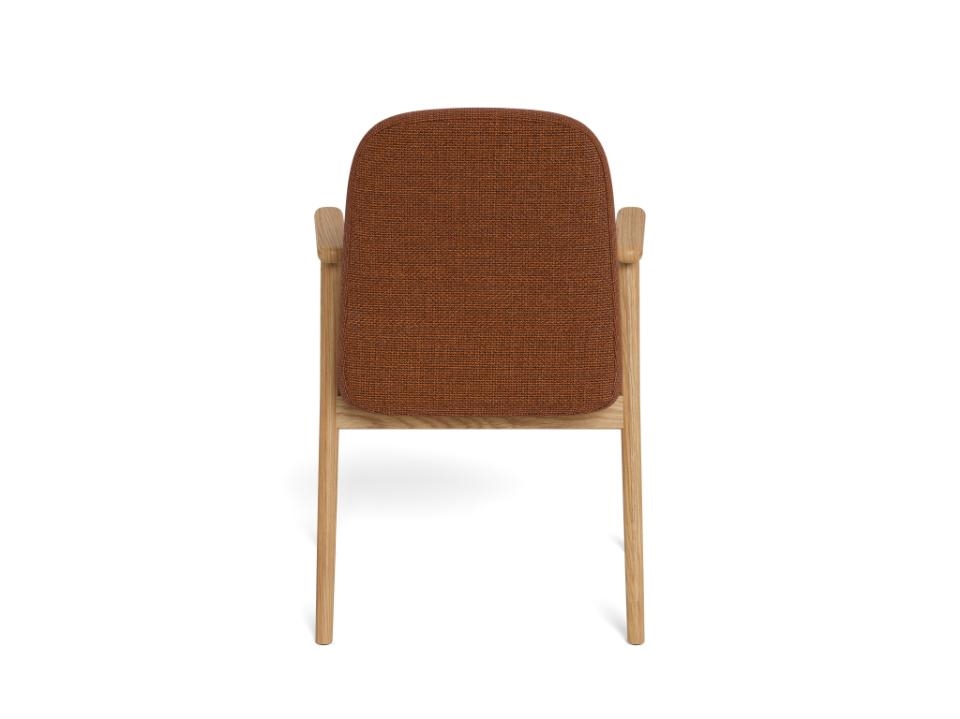 Det polstrede sæde og ryglæn sikrer en behagelig siddeoplevelse – også når middagen varer længe. Basel stoffet har en blød, men slidstærk overflade, og den varme terracottafarve skaber liv og personlighed omkring spisebordet. Armlænene giver god støtte til armene og bidrager til en afslappet siddestilling.