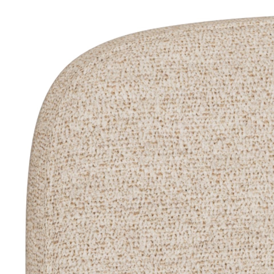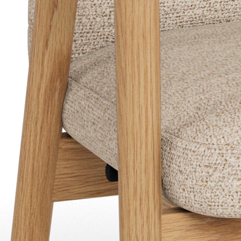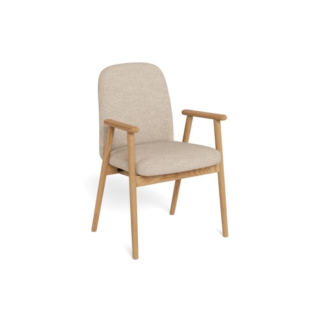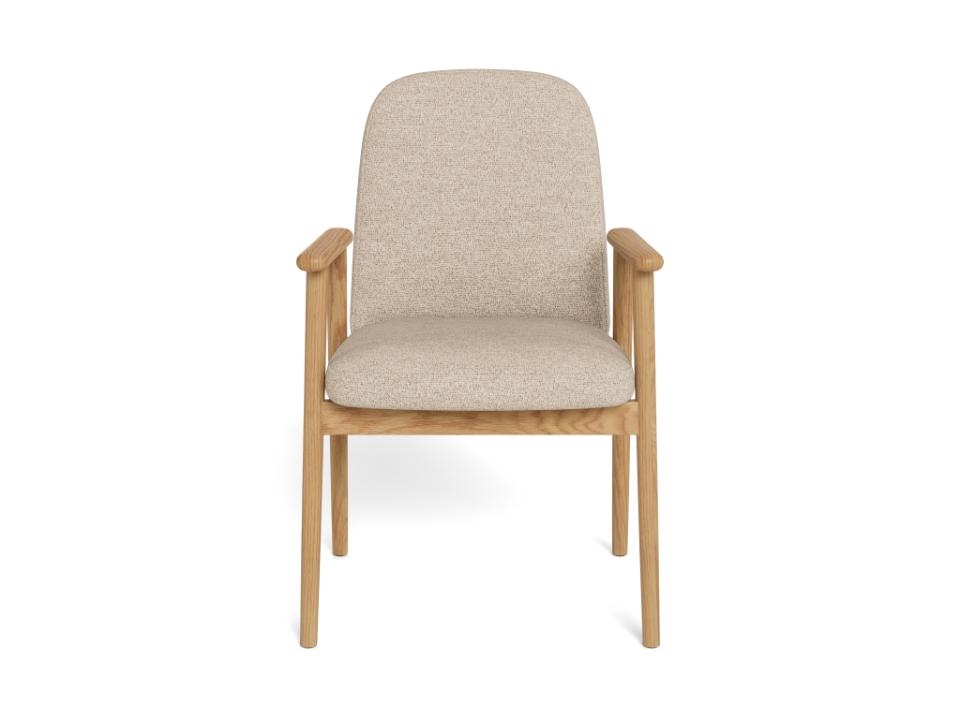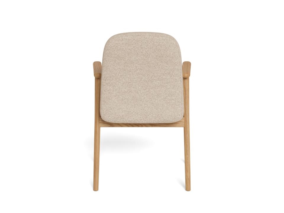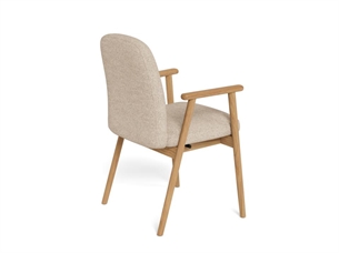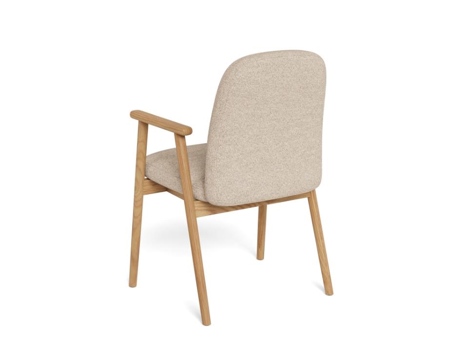 Det polstrede sæde og ryglæn giver en behagelig siddeoplevelse – også når middagen varer længe. Cona stoffet har en blød og slidstærk overflade, og den lyse beige nuance gør stolen nem at kombinere med både lyse og mørke spiseborde. Armlænene giver god støtte og bidrager til en afslappet og ergonomisk siddestilling.