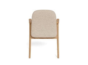 Calvin spisebordsstolens stel er udført i massiv eg og behandlet med hvidpigmenteret olie, som beskytter træet og fremhæver dets naturlige struktur. Den integrerede trinløse vippefunktion gør stolen mere dynamisk at sidde i og øger komforten i både hverdagen og ved længere middage.