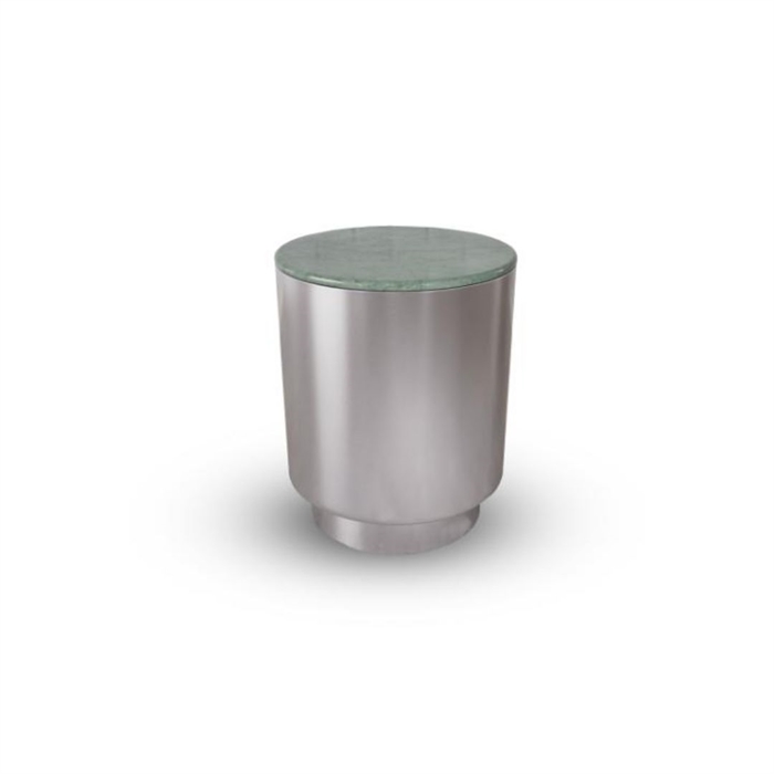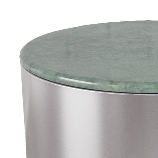 Den grønne marmor tilfører varme og karakter, mens det nikkelfarvede stel giver et elegant og let udtryk.
