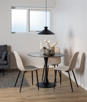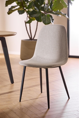 Celia spisebordsstol er en smuk kombination af funktionalitet og moderne design. Stolen er betrukket med Nesia stof i beige, der giver et varmt og indbydende udtryk. Det mat sorte ru pulverlakerede stålstel tilfører et moderne touch og sikrer stabilitet, mens de horisontale syninger på ryglænet understreger stolens eksklusive finish.