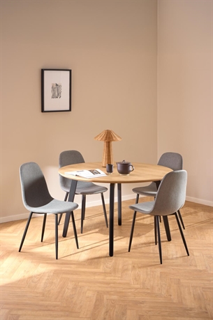 Celia spisebordsstol kombinerer eksklusiv komfort med en stilren æstetik. Stolen er betrukket med Nesia stof i mørkegrå, som giver et elegant og tidløst look. Det mat sorte ru pulverlakerede stålstel sikrer en robust konstruktion, mens de horisontale syninger på ryglænet tilføjer en ekstra detalje, der understreger stolens sofistikerede udtryk.