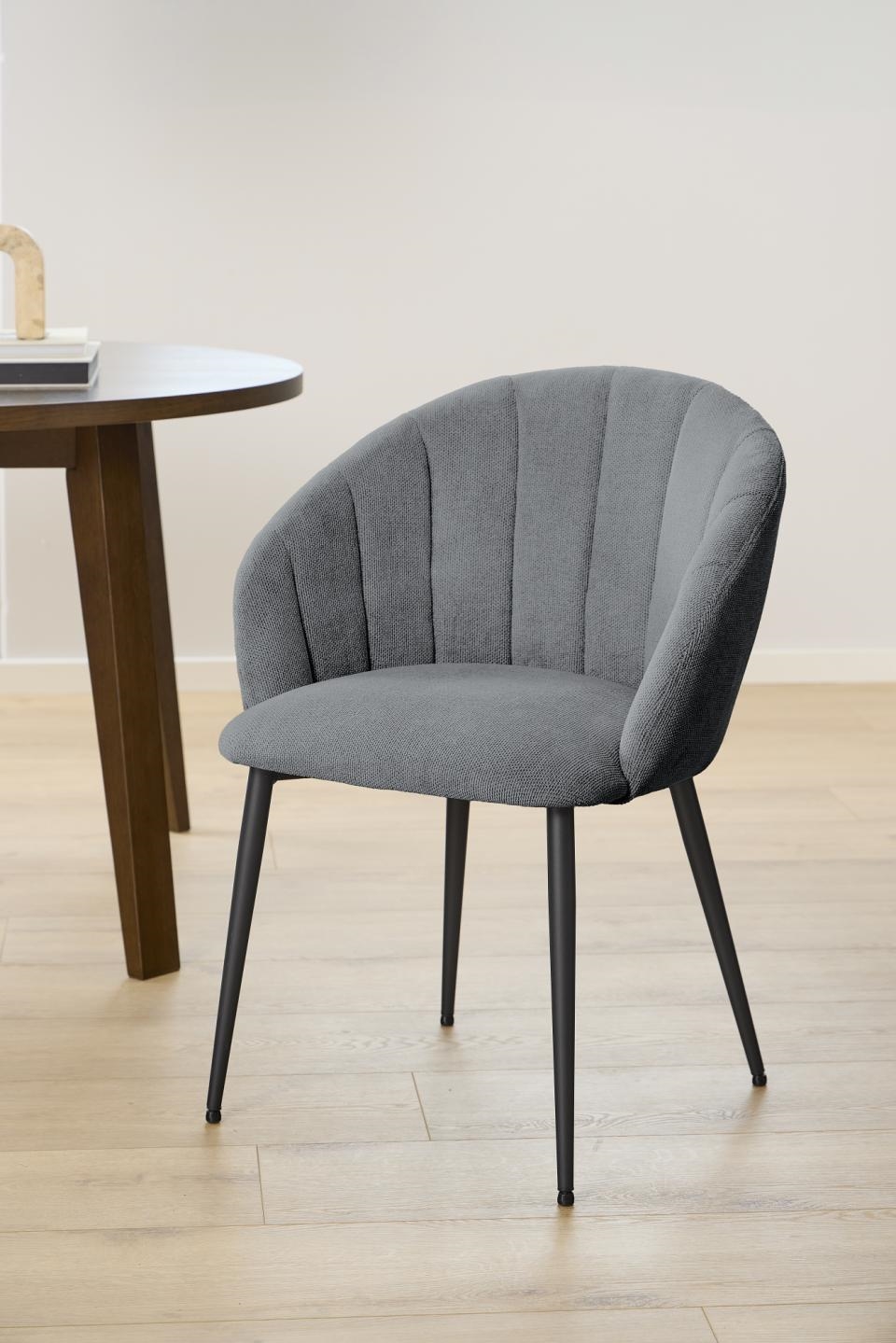 Daniella spisebordsstol med armlæn kombinerer elegant design og praktisk funktionalitet. Stolen er betrukket med slidstærkt Caso stof i antracit 17, som giver et stilrent og moderne udtryk. Det sorte stel i mat ru pulverlakeret stål fuldender designet og skaber en flot kontrast til det bløde stof.