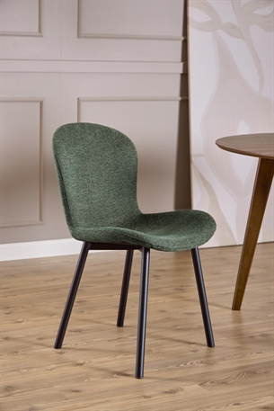 Esra spisebordsstol kombinerer moderne design med praktisk komfort. Stolen er betrukket med Apia stof i grøn 352, en dyb og elegant farve, der bringer liv til spisestuen. Stellet i mat sort ru pulverlakeret stål giver en flot kontrast til det bløde stof og sikrer samtidig stabilitet og lang holdbarhed.