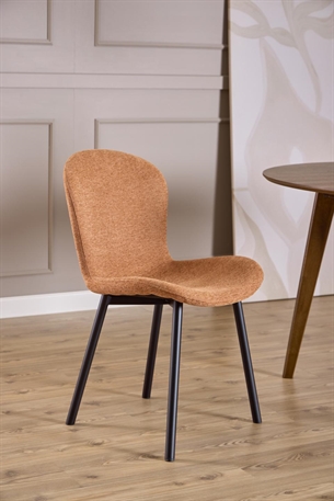 Esra spisebordsstol forener stil og komfort i en moderne udgave. Stolen er betrukket med Apia stof i terracotta 352, en smuk og varm nuance, der tilfører hygge og karakter til spiseområdet. Det robuste mat sorte ru pulverlakerede stålstel skaber en flot kontrast til den bløde tekstil og sikrer samtidig stabilitet og holdbarhed.