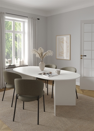 Den rummelige bordplade giver god plads til borddækning, servering og sociale aktiviteter, mens den organiske form skaber et blødt og indbydende udtryk.