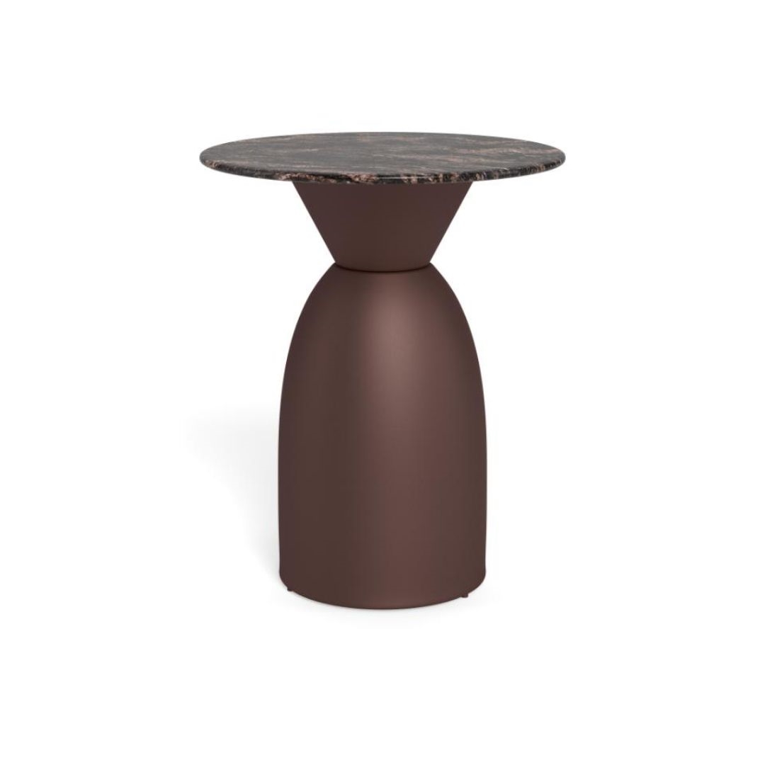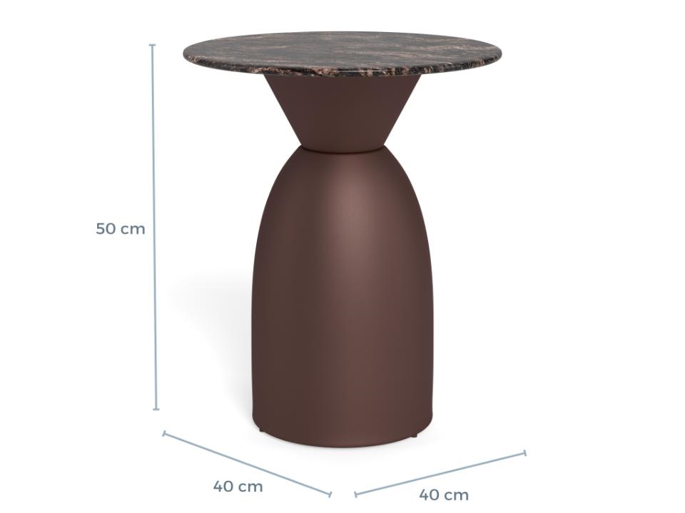 Ferrol rundt sofabord Ø40 cm i brun Cocoa marmor er et eksklusivt og stilfuldt sofabord, der tilfører varme og elegance til din indretning. Kombinationen af den mørke marmor og det bronzefarvede stel giver et luksuriøst og moderne udtryk.