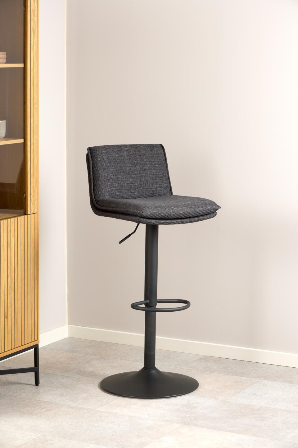 Flynn barstolen kombinerer stilrent design med optimal komfort. Den er betrukket med slidstærkt mørkegråt Basel-stof og har et stabilt trompetformet stel i mat sort, ru pulverlakeret stål. Med sin drejefunktion, justerbare højde og eksklusive lynlåsdetalje på ryglænet er Flynn barstolen det perfekte valg til både køkkenøen og hjemmebaren.
