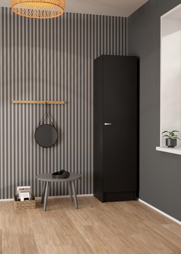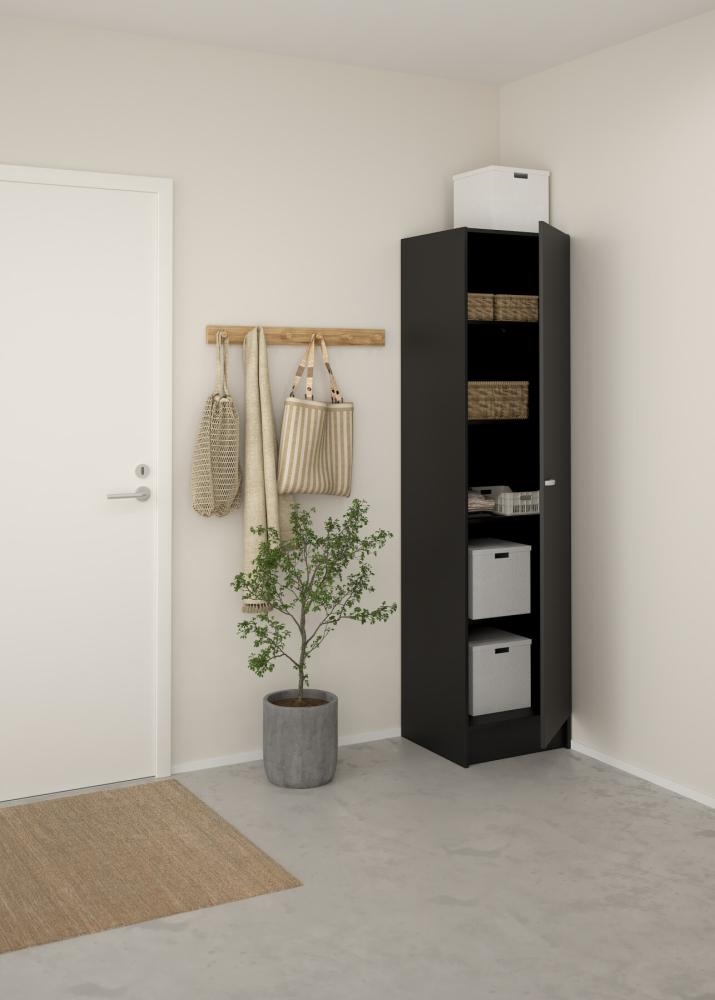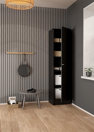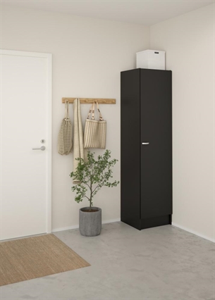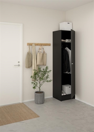 Focus garderobeskabet er fremstillet i spånplade med folie, hvilket sikrer en solid konstruktion og en overflade, der er nem at vedligeholde i hverdagen. Den matsorte finish giver et moderne og elegant udtryk, som passer ind i både lyse og mørke indretninger.