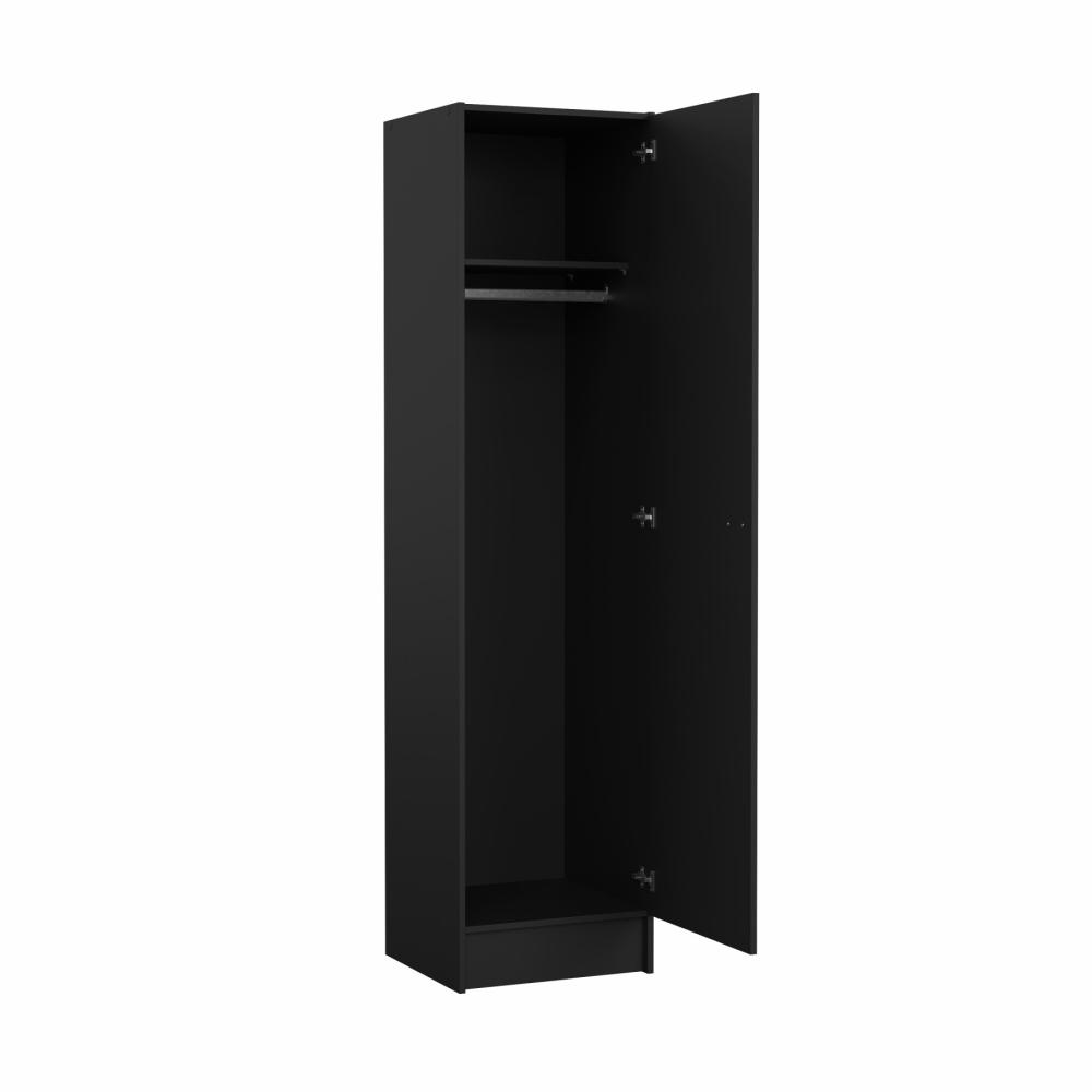 Dette Focus garderobeskab er designet med én låge og en praktisk indretning, som giver gode opbevaringsmuligheder på begrænset plads. Skabet indeholder en garderobestang til ophæng af tøj samt fire justerbare hylder, som gør det muligt at tilpasse opbevaringen efter behov.