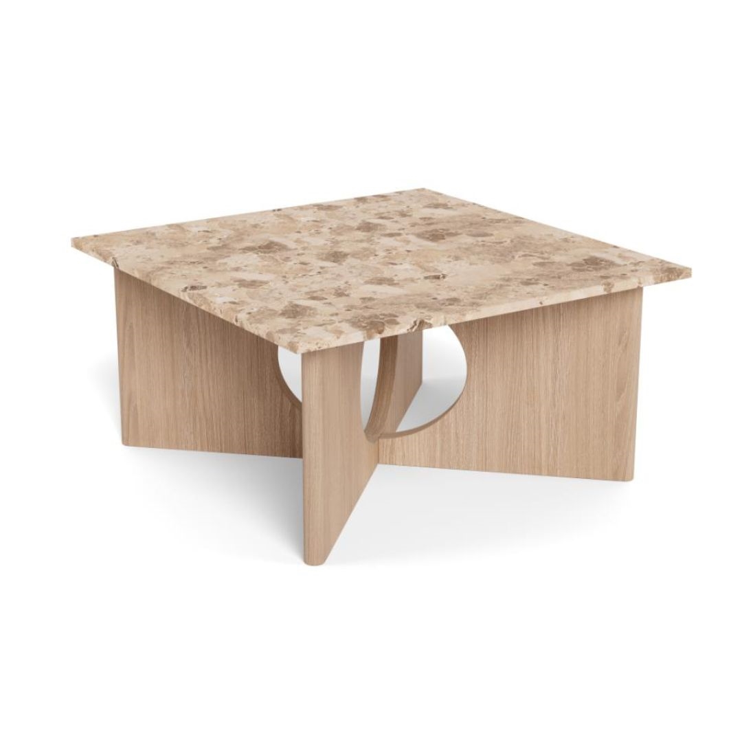 Foley firkantet sofabord med mat latte lakeret marmor er et eksklusivt og stilrent sofabord, der kombinerer moderne design med naturlige materialer. Den lyse marmorbordplade og det elegante krydsstel i hvidpigmenteret eg giver bordet et let og sofistikeret udtryk, som passer perfekt ind i moderne og nordiske stuer.