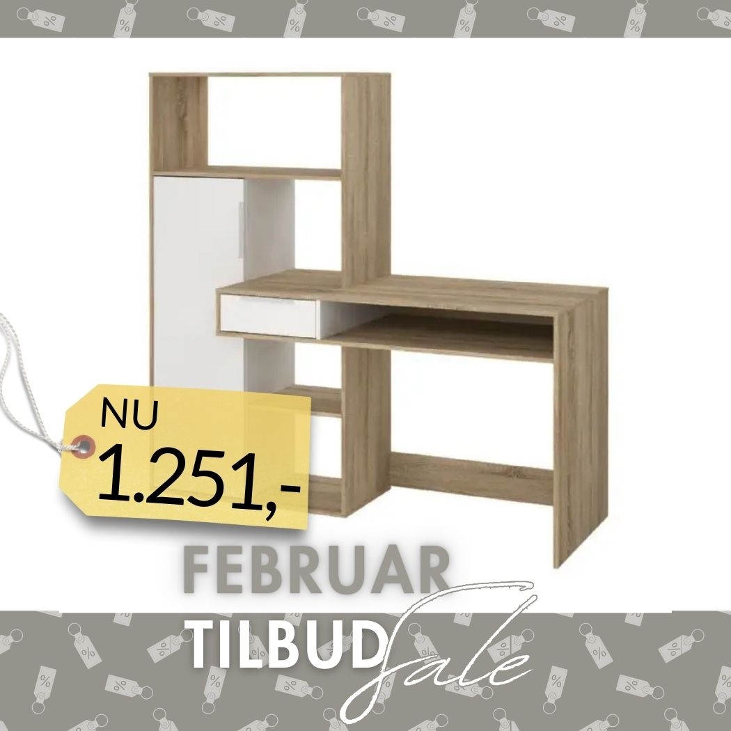 Dette skrivebord har en rummelig skuffe til småting, fire åbne opbevaringsrum i forskellige størrelser og en ekstra hylde for nem organisering. Derudover indeholder det et lukket opbevaringsrum med to justerbare hylder, der kan tilpasses dine behov.