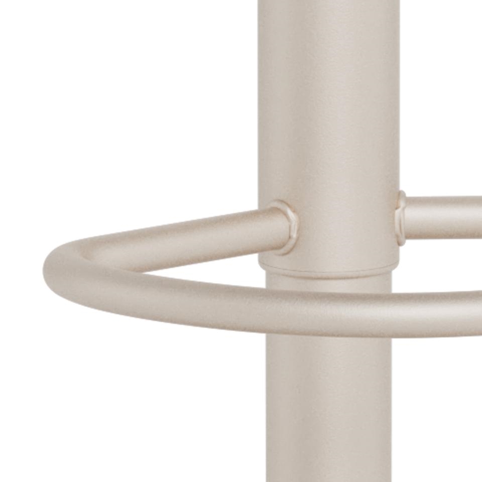 Stolen står på et stabilt trompetstel i grå ru pulverlakeret stål, som giver et moderne og stilrent udtryk. Stellets form sikrer god stabilitet og understreger barstolens elegante design.