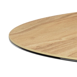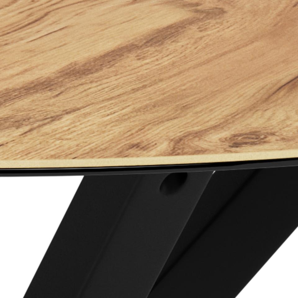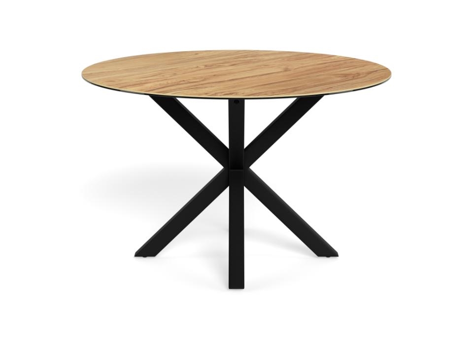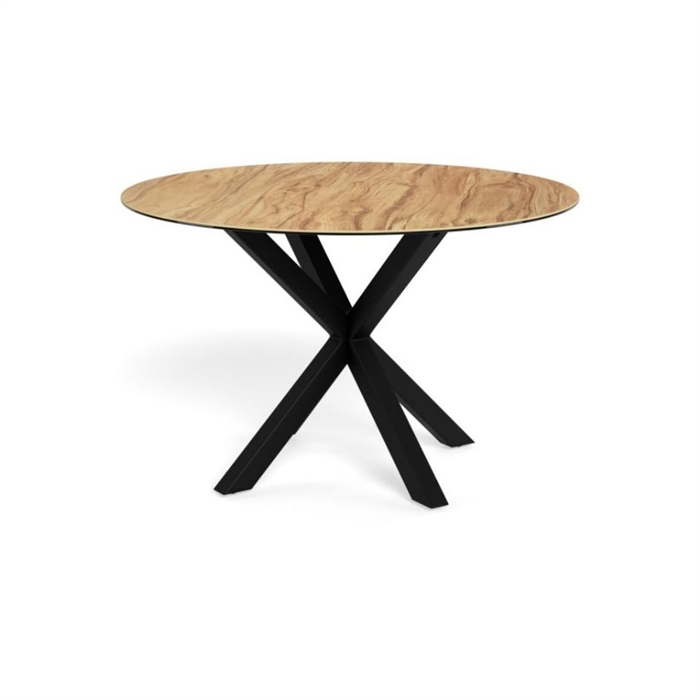 Heaven rundt spisebord er et moderne og funktionelt spisebord, der kombinerer et naturligt udtryk med slidstærke materialer. Bordpladen er udført i vild eg ru keramik/glas, som giver det varme look fra træ kombineret med keramikkens og glassets praktiske egenskaber. Det 4-stjernede stel i mat sort ru pulverlakeret stål fuldender designet med et stilrent og tidløst udtryk.