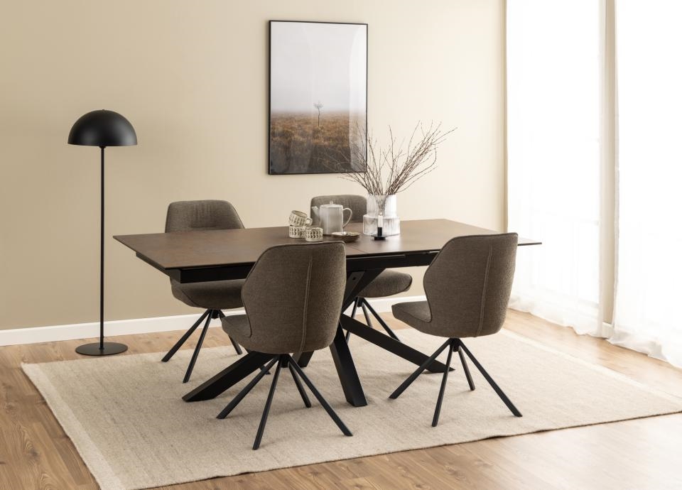 Heaven spisebord kombinerer luksuriøse materialer med praktisk funktionalitet. Den eksklusive rustbrun Lemco ru keramikbordplade giver et varmt og sofistikeret udtryk, mens det krydsede stel i mat sort ru pulverlakeret stål tilfører en moderne, industriel elegance. Bordet har et synkront udtræk, der gør det nemt at udvide længden fra 200 cm til 240 cm, og de medfølgende tillægsplader kan opbevares diskret i bordet.