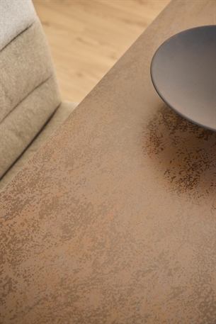 Den rustbrune keramiske bordplade kombinerer et råt, industrielt look med en slidstærk og praktisk overflade, der er modstandsdygtig over for ridser, varme og pletter. Det sorte krydsstel i pulverlakeret stål giver en flot kontrast og understøtter bordets moderne design.