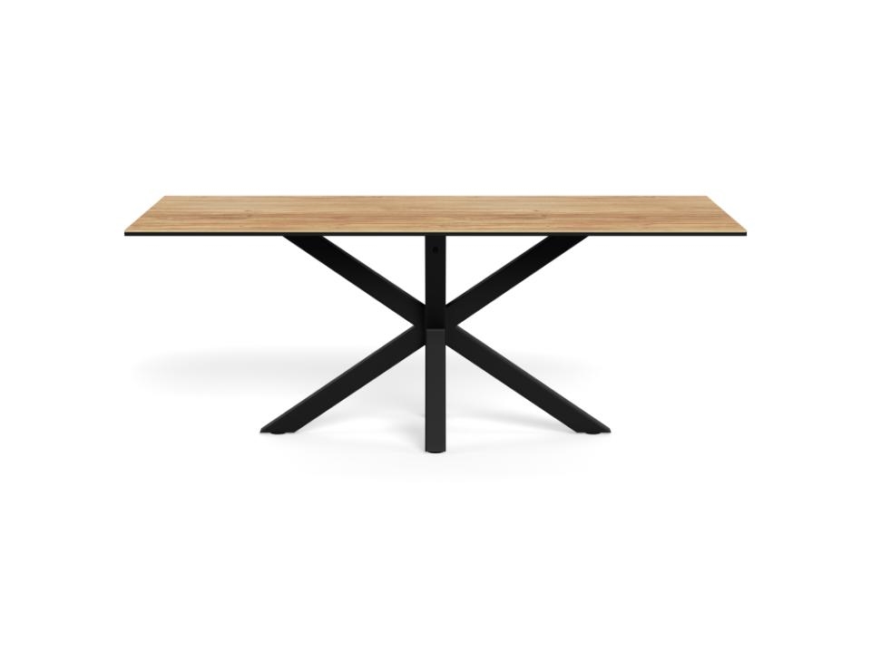 Heaven rektangulært spisebord er et rummeligt og moderne spisebord, der kombinerer et naturligt trælook med slidstærke materialer. Bordpladen er udført i vild eg ru keramik/glas, som giver et varmt og levende udtryk, samtidig med at overfladen er praktisk og modstandsdygtig. Det 4-stjernede stel i mat sort ru pulverlakeret stål fuldender designet med et stilrent og solidt udtryk.