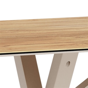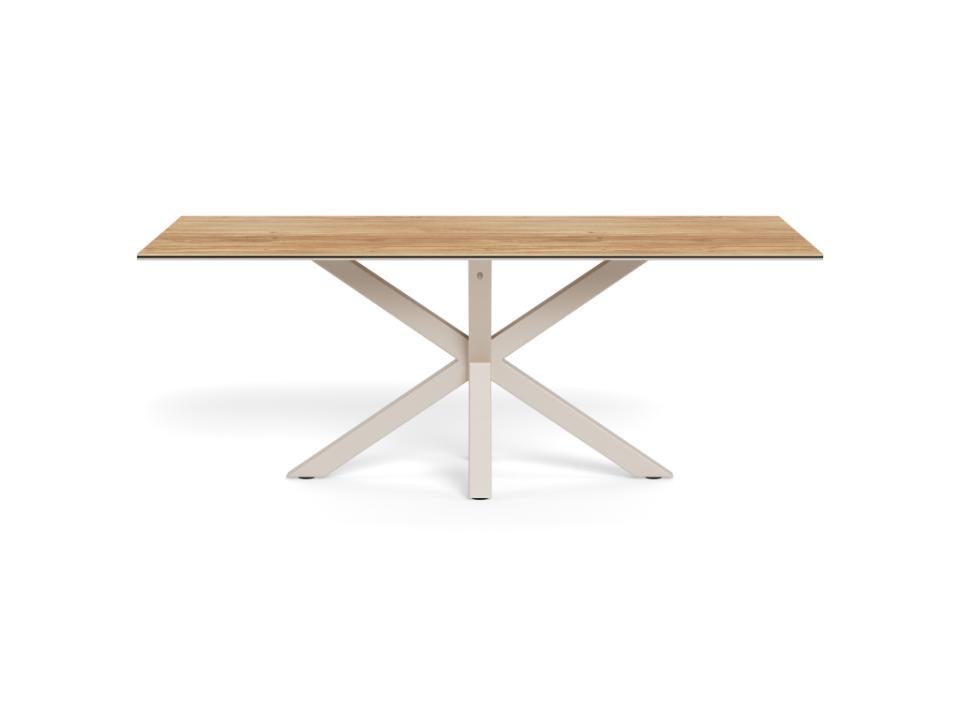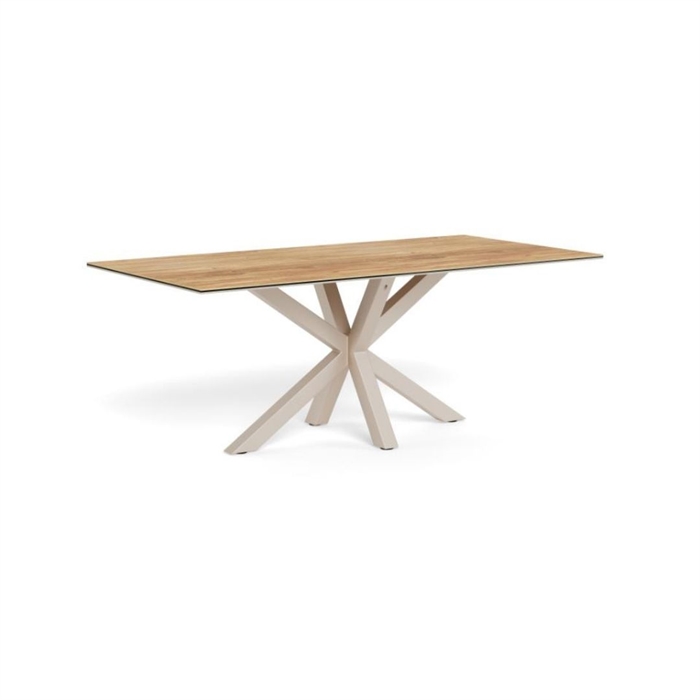 Heaven rektangulært spisebord er et rummeligt og moderne spisebord, der kombinerer et naturligt trælook med slidstærke materialer. Bordpladen er udført i vild eg ru keramik/glas, som giver et varmt og levende udtryk, samtidig med at overfladen er praktisk og modstandsdygtig. Det 4-stjernede stel i grå ru pulverlakeret stål tilfører et let industrielt præg og sikrer høj stabilitet.