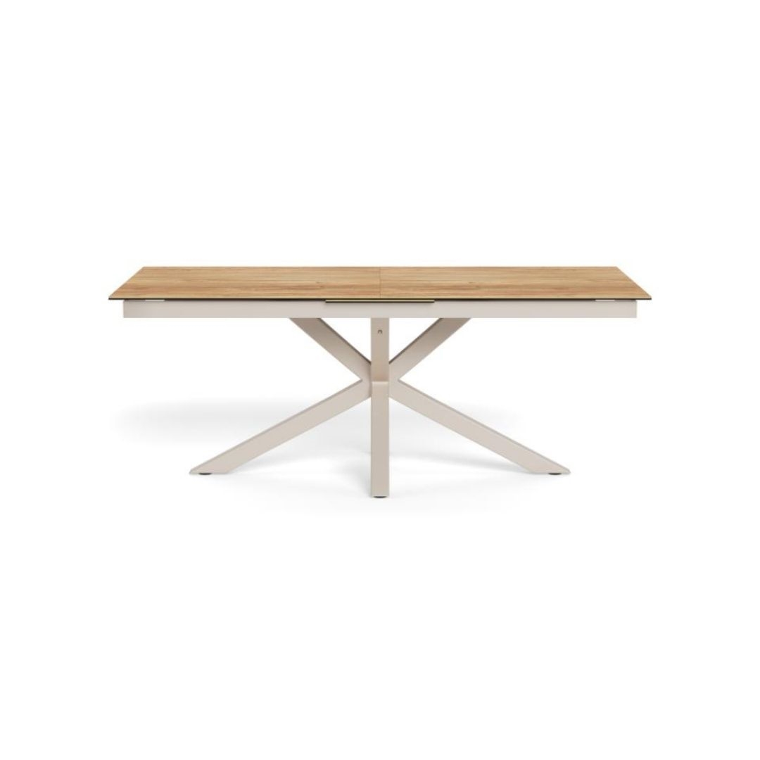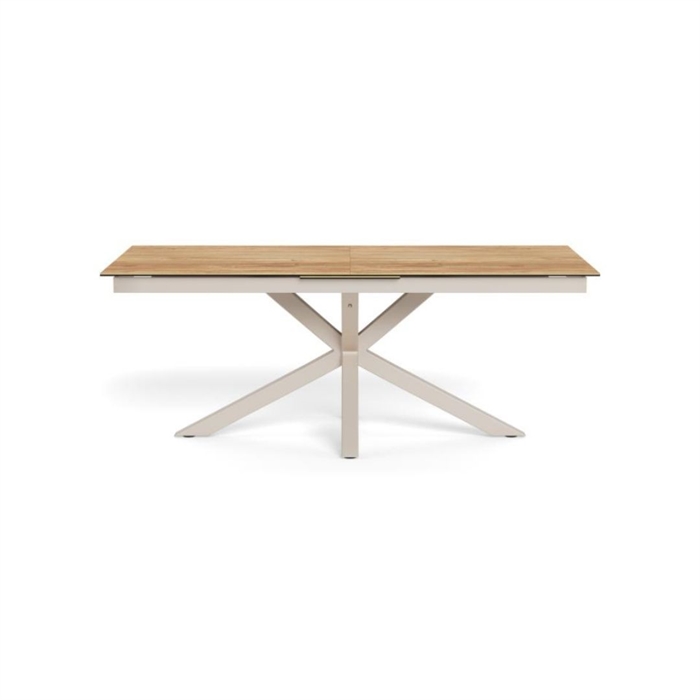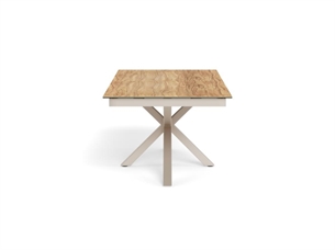 Heaven rektangulært spisebord med synkron udtræk er et rummeligt og fleksibelt spisebord, der er skabt til både hverdag og større sammenkomster. Bordpladen er udført i vild eg ru keramik/glas, som kombinerer et naturligt trælook med keramikkens slidstærke og praktiske egenskaber. Det 4-stjernede stel i grå ru pulverlakeret stål fuldender bordet med et moderne, afdæmpet udtryk og høj stabilitet.