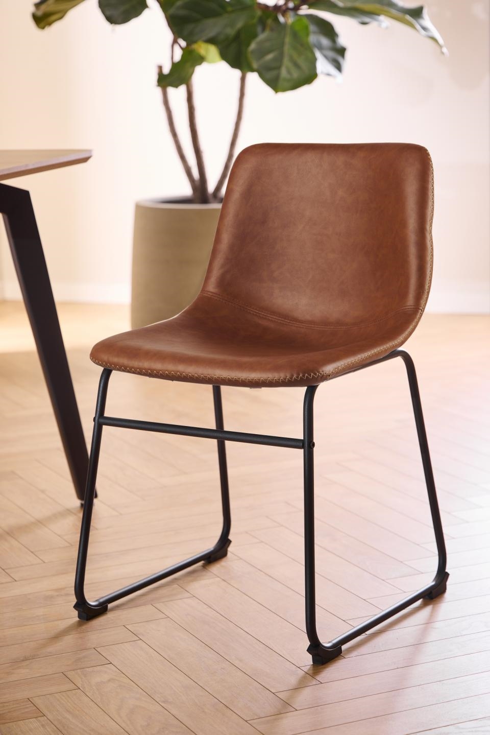 Den cognacfarvede PU-polstring tilfører stolen et varmt og eksklusivt look, mens det matsorte slædestel giver en stilfuld kontrast. De zigzag-syninger og cremefarvede detaljer fuldender stolens design, hvilket gør den perfekt til moderne, industrielle og skandinaviske indretninger.