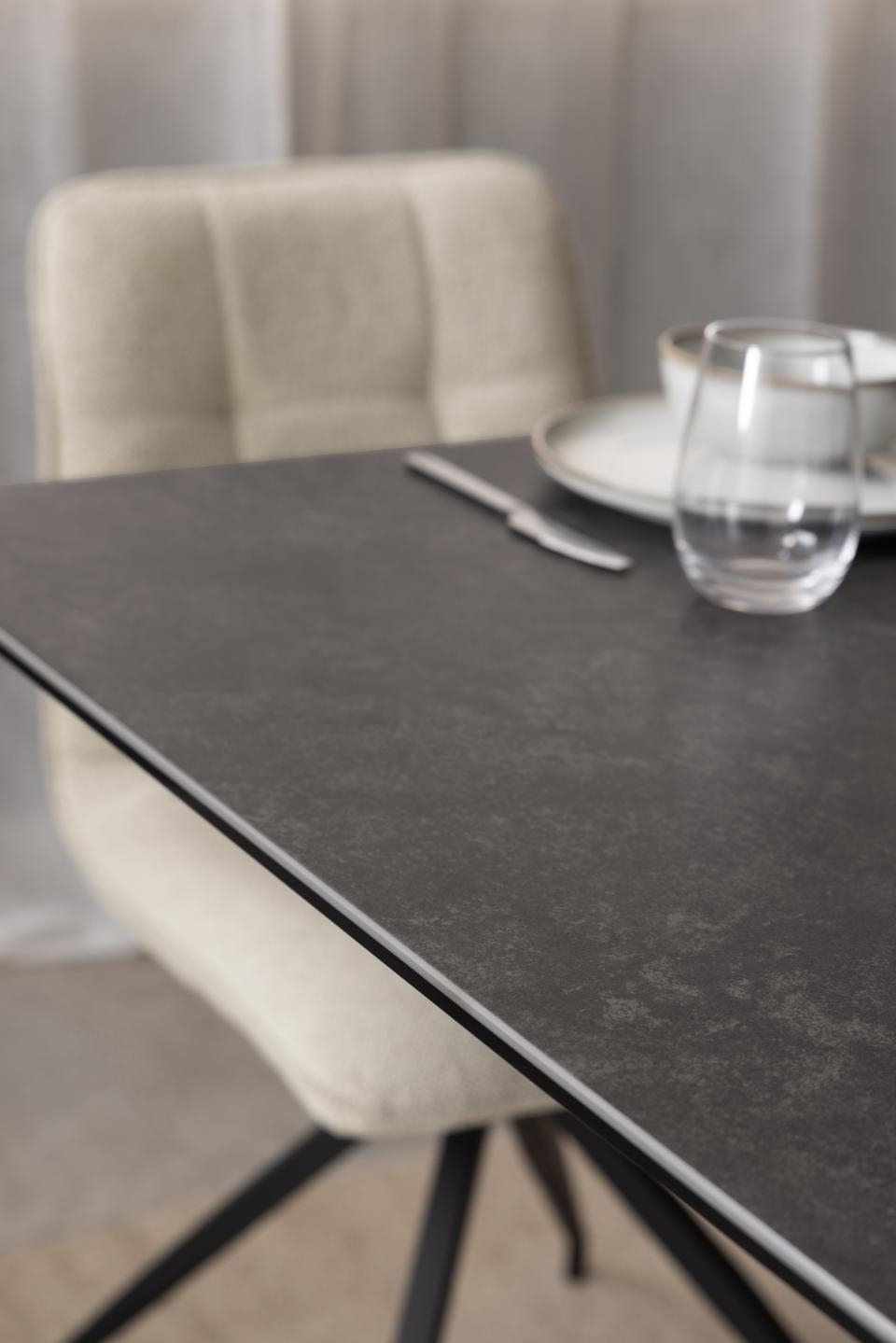 Irwine spisebord kombinerer moderne luksus med praktisk anvendelighed. Den stilfulde sort Fairbanks ru keramikbordplade giver et eksklusivt og sofistikeret udtryk, mens det krydsede stel i mat sort ru pulverlakeret stål tilføjer en moderne, industriel æstetik. Med et smart synkront udtræk kan bordet nemt forlænges fra 168 cm til 210 cm, og de medfølgende tillægsplader opbevares praktisk i bordet.