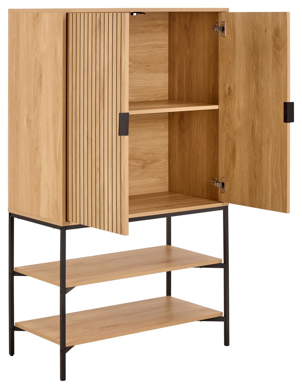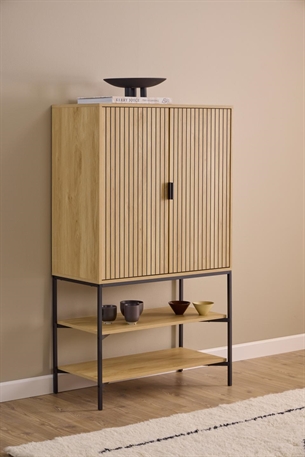 De to døre med lamelfront skaber et elegant udtryk og gør skabet til et dekorativt element i hjemmet. Med tre rummelige hylder får du masser af plads til opbevaring af bøger, dekorationer, service eller andre ting, der skal være inden for rækkevidde, men samtidig skjult bag de stilfulde låger.