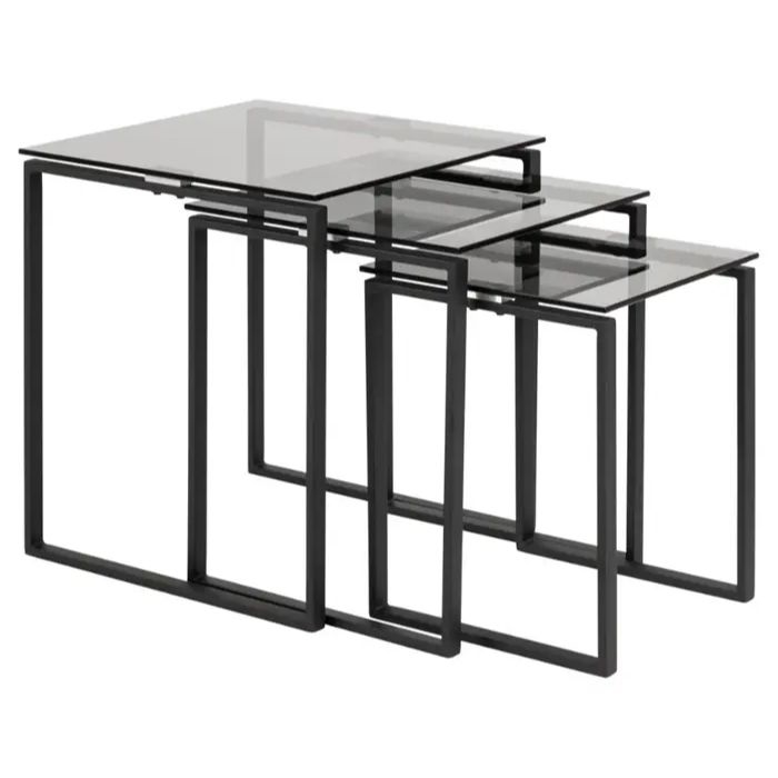 Katrine firkantet indskudsbord er et stilfuldt og funktionelt sæt bestående af 3 borde, der giver fleksible anvendelsesmuligheder i hjemmet. Bordpladen er fremstillet i røg hærdet glas, hvilket giver et elegant og sofistikeret udtryk samt en robust og ridsefast overflade. Stellet er udført i mat sort ru pulverlakeret stål med et slæde-design, der sikrer stabilitet og understreger bordets moderne, industrielle look.