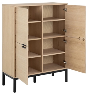 Kensington skabet har et funktionelt design med fire døre og seks rummelige hylder, hvilket gør det ideelt til opbevaring i stuen, spisestuen eller soveværelset. Den stilrene kombination af lyse trænuancer og sort stel passer perfekt til både skandinavisk og moderne indretning.