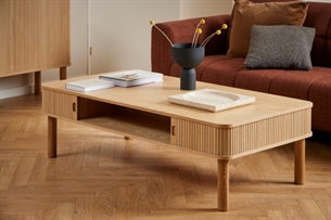 Forestil dig en hyggelig aften i din stue med Langley sofabord som det naturlige samlingspunkt. Placer dine yndlingsbøger og en varm kop kaffe på bordets rummelige overflade, mens fjernbetjeninger og magasiner diskret gemmes bag skydedøren. Med dette bord får du en kombination af funktionalitet og æstetik, der gør din dagligstue både stilfuld og organiseret.