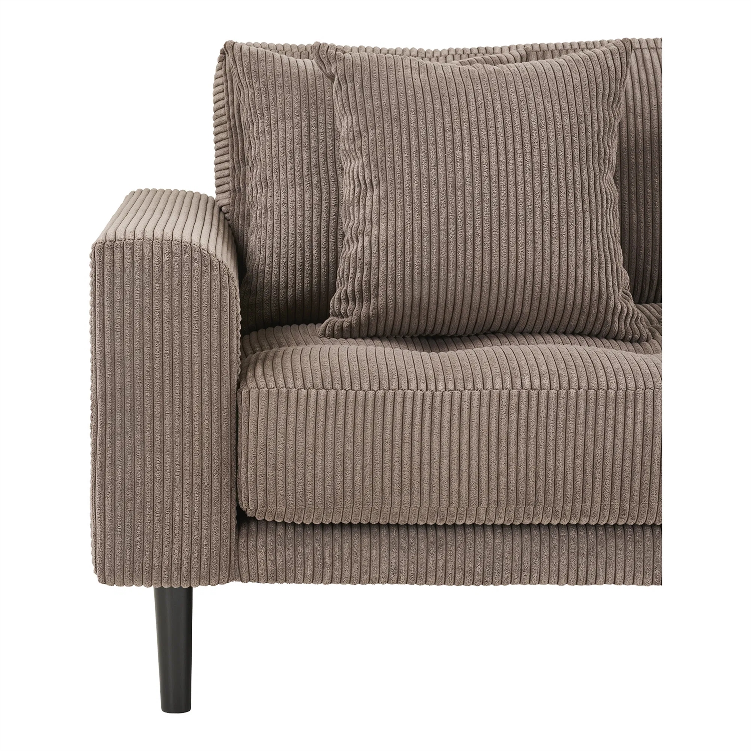 Den brune fløjl bringer varme og dybde til rummet, mens de sorte træben tilføjer en markant og moderne kontrast. Materialevalget sikrer en behagelig overflade med let glans og blød tekstur, der løfter indretningen.