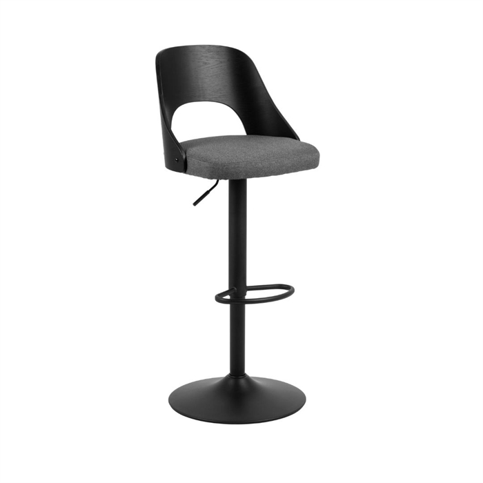 Kombinationen af mørkegråt stof, trædetaljer og sort stel giver et moderne og eksklusivt udtryk. Barstolen passer perfekt ind i både skandinaviske og industrielle indretninger.